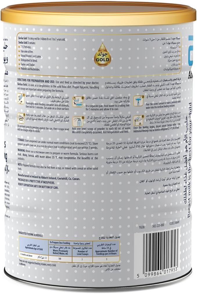 Similac Gold is an infant formula based on cow's milk for children from birth on wards.This formula 3 from 1-3 years. A breakthrough formula that enhances immnunity. New and improved formula with HMO. Clinically proven results to strenghten immnunity. Delivers more brain power form learning. Better absorption of key brain nutrients.