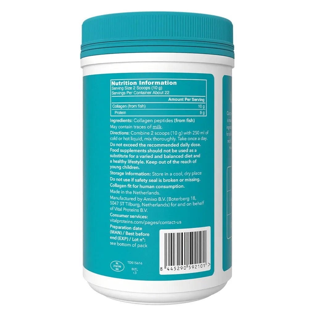 Vital Proteins Marine Collagen Unflavoured Powder For Hair, Skin & Nails is a marine collagen supplement that’s designed to help support your body’s natural collagen supply. Collagen is found in all our connective tissues, tendons, ligaments, and bones. As we get older, our bodies become less efficient at producing collagen, which is why it is recommended to introduce ingestible collagen to your diet. Vital Protein Marine Collagen contains 10g of collagen peptides per serving and is made from the scales of fresh, non-GMO Certified, wild-caught cod. It's highly bioavailable and digestible. Marine collagen powder is an easy, convenient way to introduce a collagen supplement into your routine. Vital Protein marine collagen features type I and type III collagen and it is sourced from the skin and scales of FISH these are natural by-products of the seafood industry that would otherwise be discarded. Marine collagen may help delay some signs of aging, like wrinkles, joint issues, and weakness. Besides the anti-aging benefits, fish collagen also provides an alternative to people who have issues about using other forms of collagen.