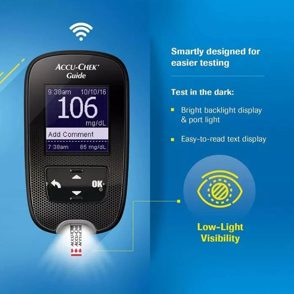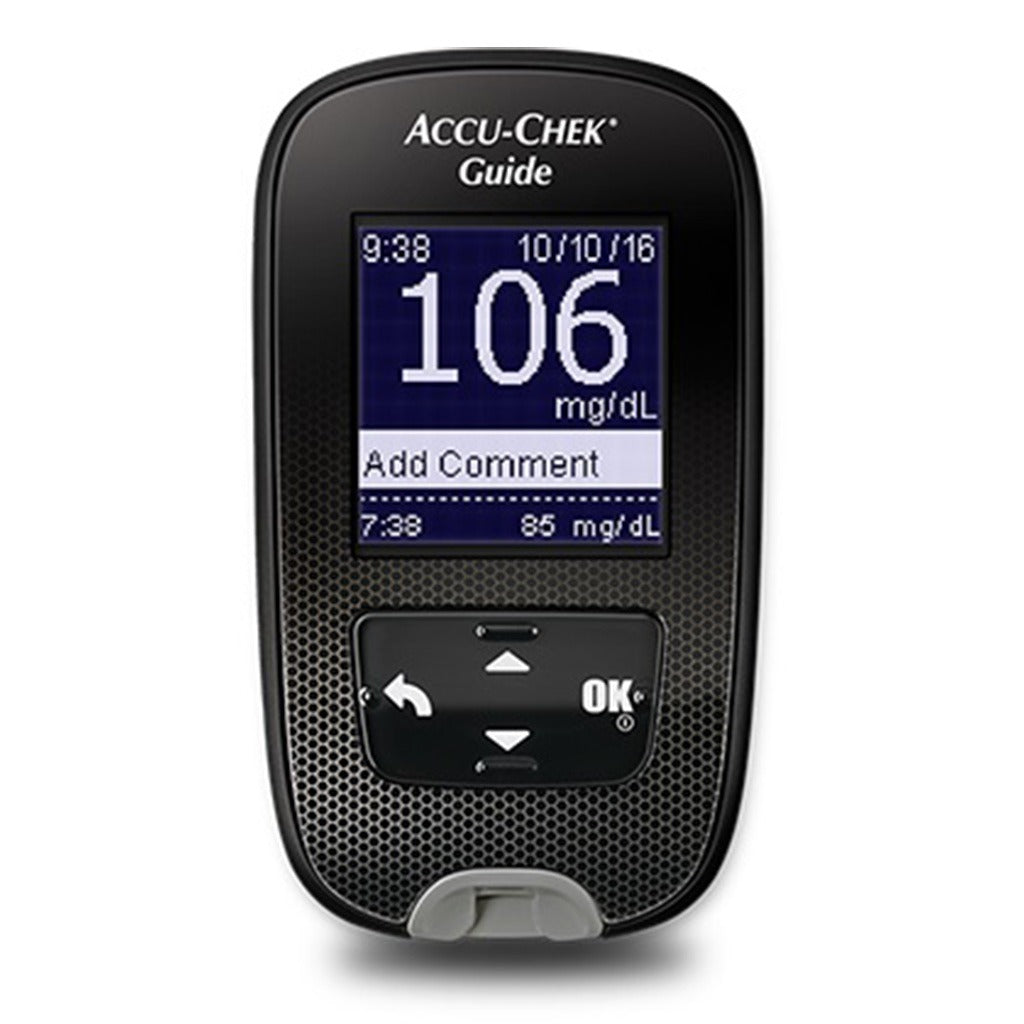 Accu-Chek Guide Wireless Blood Glucose Monitoring System is an over-the-counter (OTC) device utilized by persons with diabetes in home settings for the quantitative measurement of glucose in whole blood, and is for single-patient use only, and should not be shared. Testing your blood glucose regularly can make a big difference in how you manage your diabetes. Analyzing your blood glucose results stored in the meter is an effective way for you and your healthcare professional to determine how well you are controlling your diabetes. This analysis is a valuable tool for making improvements to your diabetes management. Accu-Chek blood glucose meter has a backlit LCD screen, provides a fast measurement in less than 4 seconds. After the measurement you can add a marker to indicate if the measurement has been before or after food, fasting etc. It's easy to record results without a paper log that automatically records results directly to the (mysugar diabetes management app) smartphone. It features a push button strip ejector, means you don't have to touch used strips. Makes it simple to dispose off used strips. It also has auto power off feature; 15 seconds after removing a test strip & 90 seconds otherwise. It also contains the Accu-Chek Softclix lancing device, is intended for the hygienic collection of capillary blood for testing purposes from the side of a fingertip and from other sites, such as the palm, the upper arm, and the forearm, which is referred to as non-fingertip testing or alternate site testing. Its rotatable cap offers 11 fixed depth settings for different skin types. Roche Diabetes Care is a pioneer in the development of blood glucose monitoring systems and a global leader for diabetes management systems and services. For more than 40 years, the Accu-Chek brand has been dedicated to enable people with diabetes to live life as normal and active as possible as well as to empower healthcare professionals manage their patients’ condition in an optimal way. Today, the Accu-Chek portfolio offers people with diabetes and healthcare professionals innovative products and impactful solutions for convenient, efficient and effective diabetes management. It encompasses blood glucose meters, lancing devices, data management systems and education programs – contributing to an improved medical outcome.